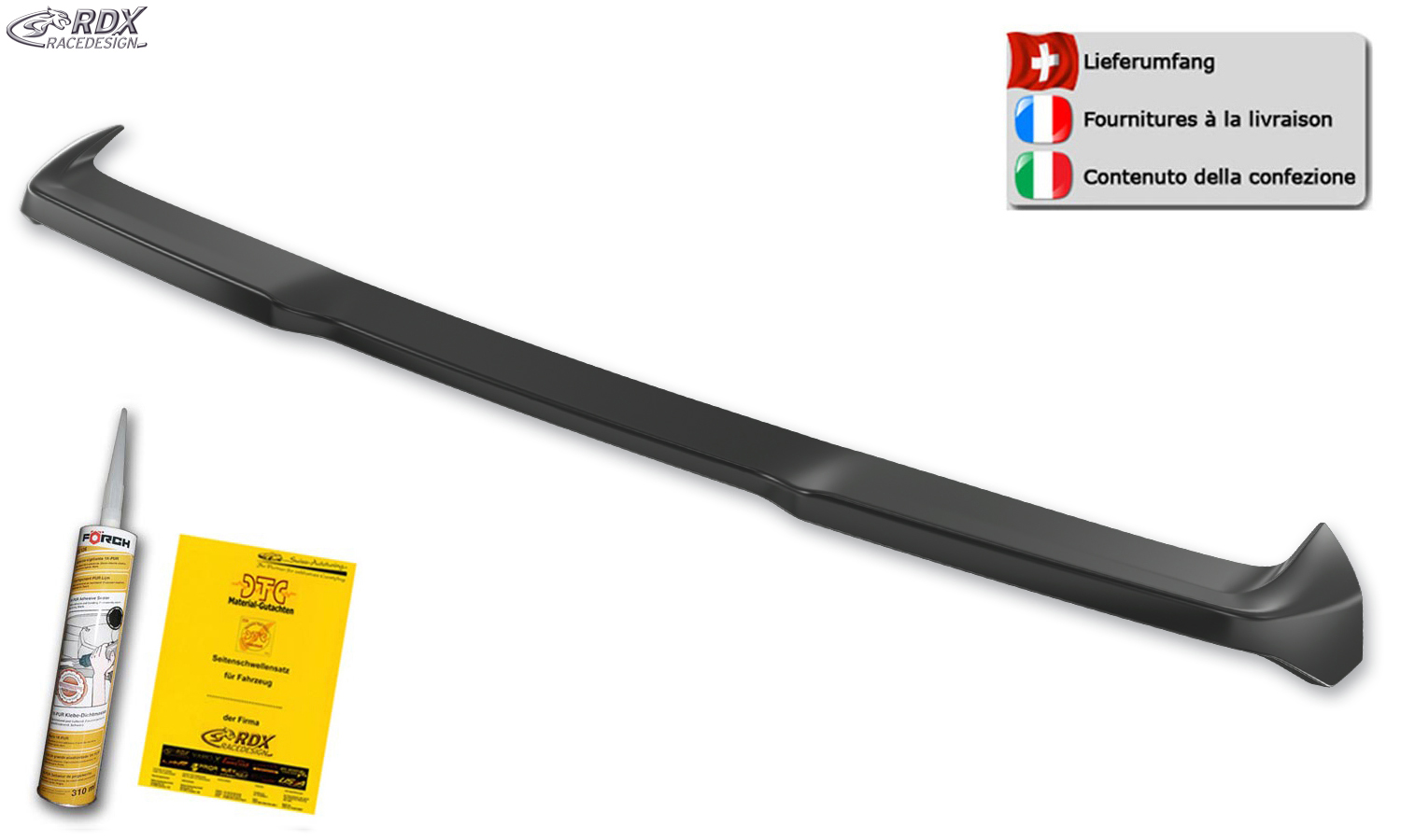 > Einfache Klebemontage (ohne bohren) mit beiliegendem Karosseriekleber. Der Spoiler muss lückenlos vollflächig, über die gesamte Klebefläche verklebt werden.
