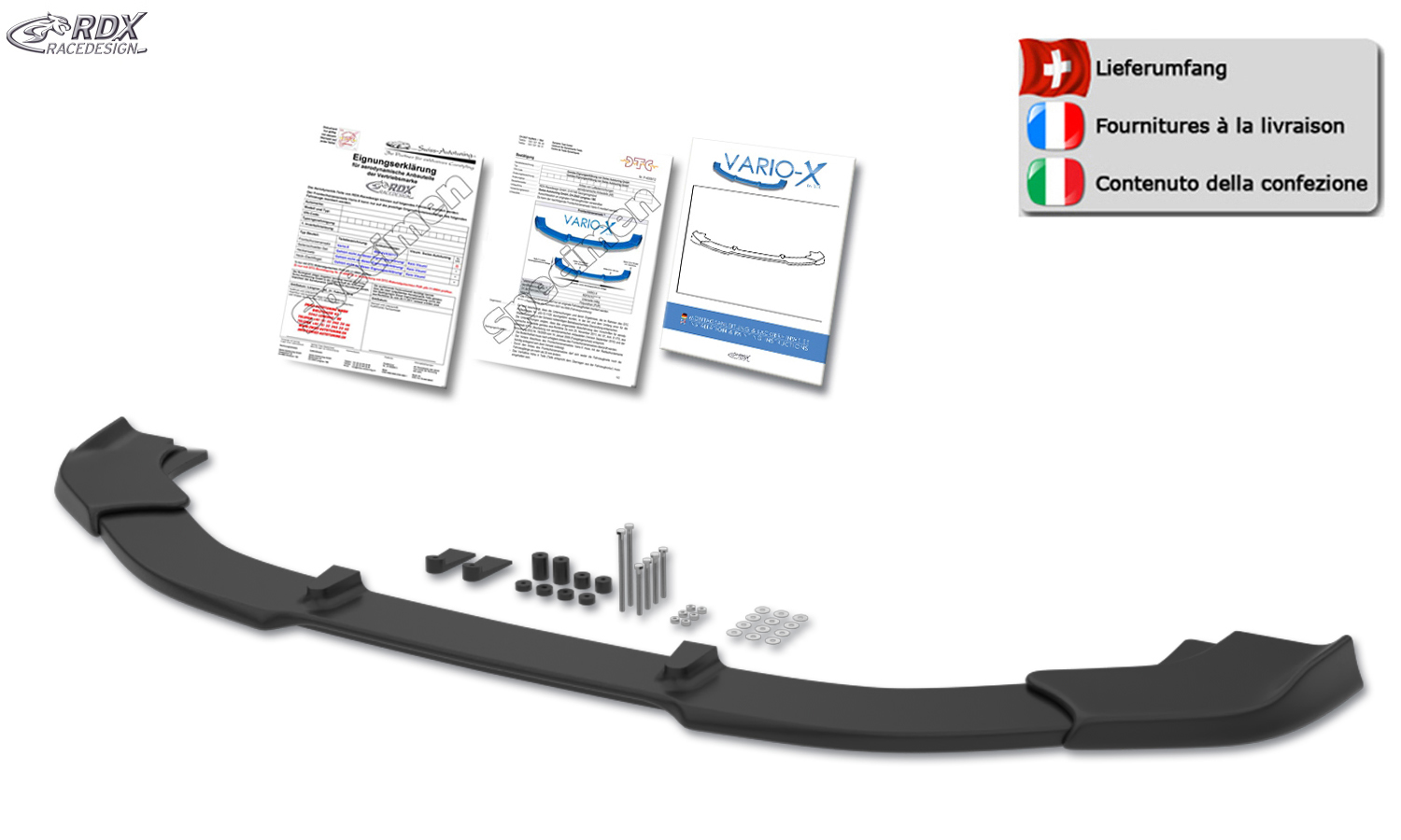 Der VARIO-X ist ein innovatives Qualitätsprodukt von RDX. Dieser formschöne Frontspoiler wird aus hochwertigem PUR Kunststoff (Polyurethan) hergestellt. Dieses Material wird auch in der Erstausrüstung verwendet und ist äußerst bruchsicher. Der VARIO-X wird unlackiert in schwarz geliefert und hat eine sauber verarbeitete, lackierfreundliche Oberfläche.