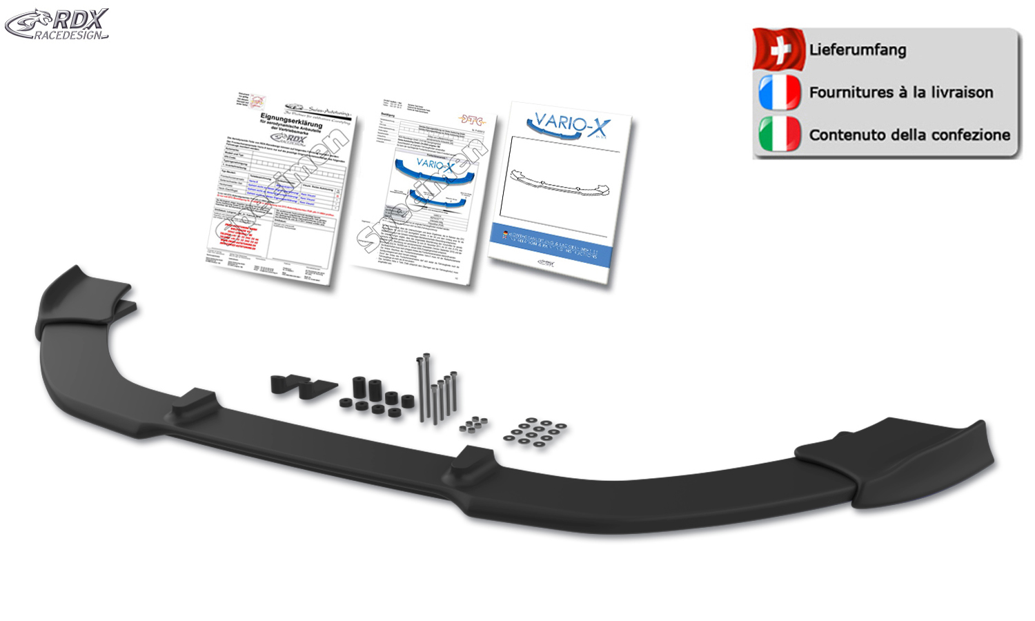 Der VARIO-X ist ein innovatives Qualitätsprodukt von RDX. Dieser formschöne Frontspoiler wird aus hochwertigem PUR Kunststoff (Polyurethan) hergestellt. Dieses Material wird auch in der Erstausrüstung verwendet und ist äußerst bruchsicher. Der VARIO-X wird unlackiert in schwarz geliefert und hat eine sauber verarbeitete, lackierfreundliche Oberfläche.