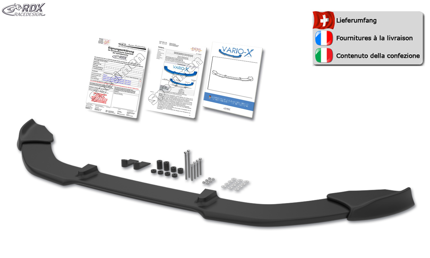 Der VARIO-X ist ein innovatives Qualitätsprodukt von RDX. Dieser formschöne Frontspoiler wird aus hochwertigem PUR Kunststoff (Polyurethan) hergestellt. Dieses Material wird auch in der Erstausrüstung verwendet und ist äußerst bruchsicher. Der VARIO-X wird unlackiert in schwarz geliefert und hat eine sauber verarbeitete, lackierfreundliche Oberfläche.