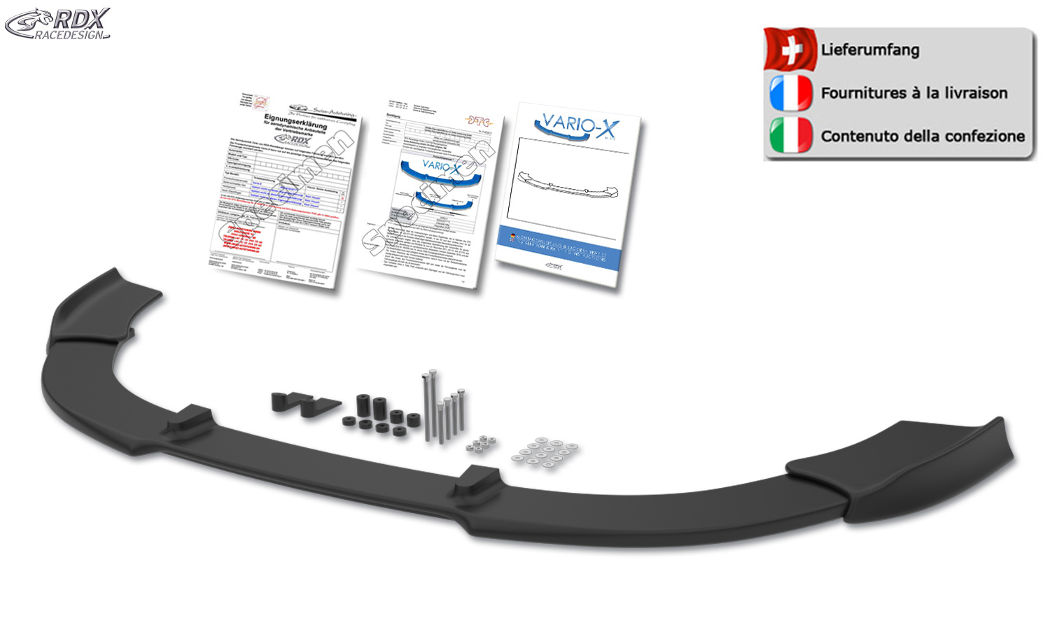 Der VARIO-X ist ein innovatives Qualitätsprodukt von RDX. Dieser formschöne Frontspoiler wird aus hochwertigem PUR Kunststoff (Polyurethan) hergestellt. Dieses Material wird auch in der Erstausrüstung verwendet und ist äußerst bruchsicher. Der VARIO-X wird unlackiert in schwarz geliefert und hat eine sauber verarbeitete, lackierfreundliche Oberfläche.