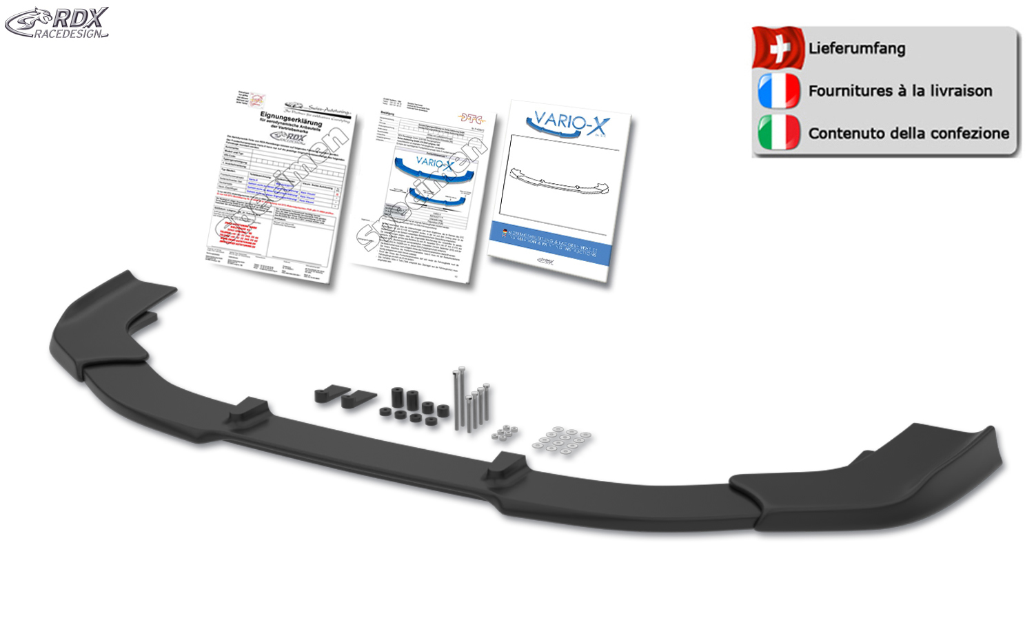 Der VARIO-X ist ein innovatives Qualitätsprodukt von RDX. Dieser formschöne Frontspoiler wird aus hochwertigem PUR Kunststoff (Polyurethan) hergestellt. Dieses Material wird auch in der Erstausrüstung verwendet und ist äußerst bruchsicher. Der VARIO-X wird unlackiert in schwarz geliefert und hat eine sauber verarbeitete, lackierfreundliche Oberfläche.
