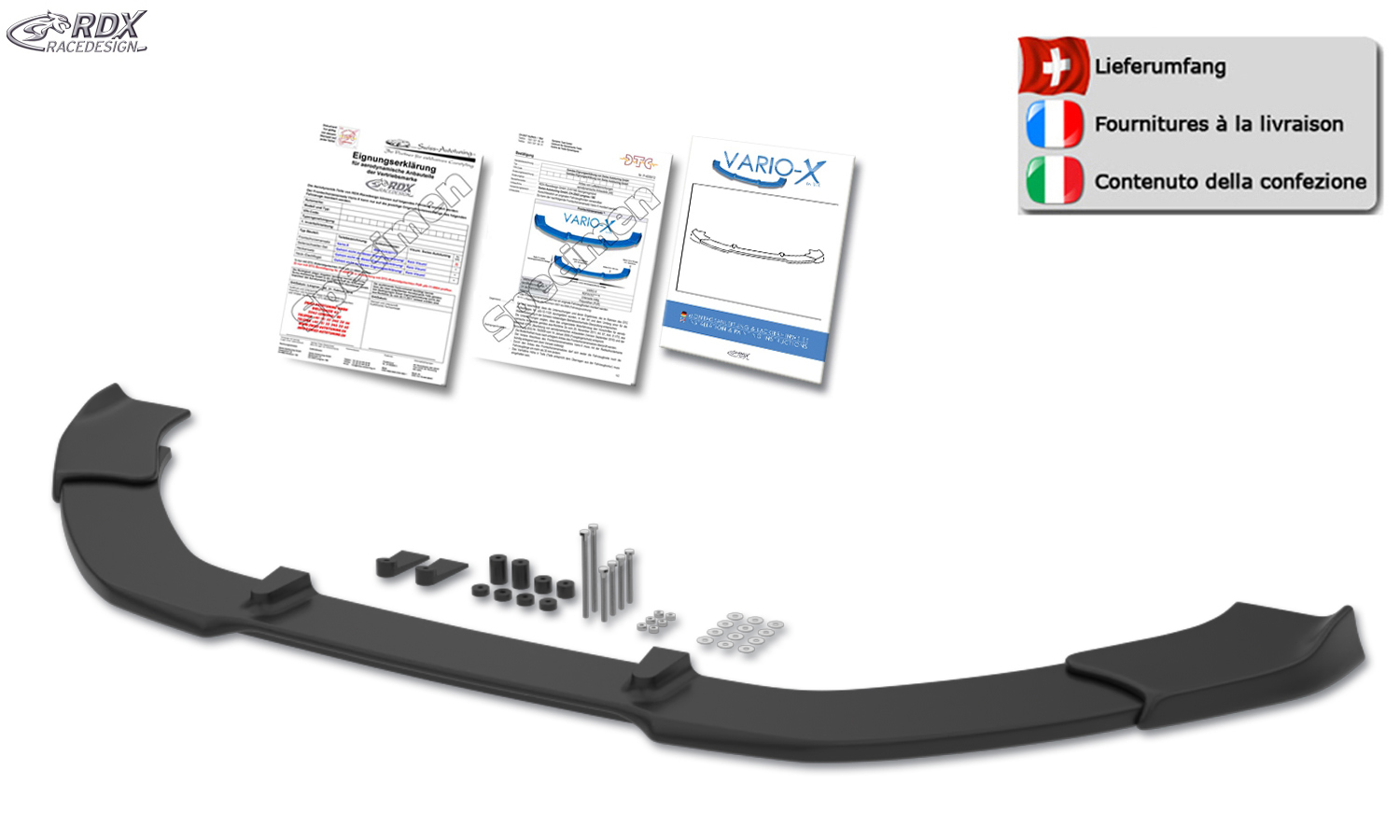 Der VARIO-X ist ein innovatives Qualitätsprodukt von RDX. Dieser formschöne Frontspoiler wird aus hochwertigem PUR Kunststoff (Polyurethan) hergestellt. Dieses Material wird auch in der Erstausrüstung verwendet und ist äußerst bruchsicher. Der VARIO-X wird unlackiert in schwarz geliefert und hat eine sauber verarbeitete, lackierfreundliche Oberfläche.