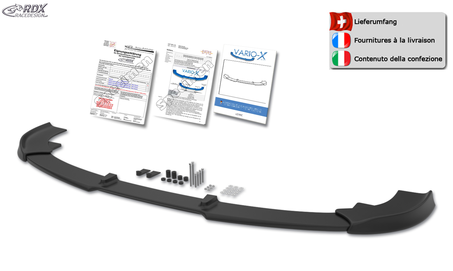 Der VARIO-X ist ein innovatives Qualitätsprodukt von RDX. Dieser formschöne Frontspoiler wird aus hochwertigem PUR Kunststoff (Polyurethan) hergestellt. Dieses Material wird auch in der Erstausrüstung verwendet und ist äußerst bruchsicher. Der VARIO-X wird unlackiert in schwarz geliefert und hat eine sauber verarbeitete, lackierfreundliche Oberfläche.